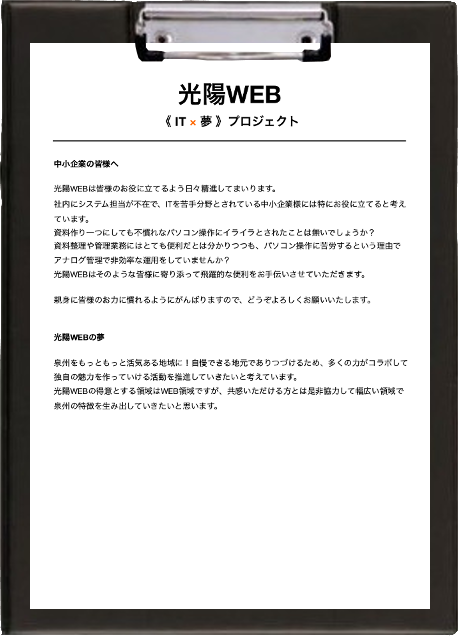 しかし、WEBサイトに頼りすぎると人とのつながりが希薄になる場合もあるかもしれません。目的を明確にすることで一期一会を生み出す大変便利な道具として光陽WEBはおすすめします。